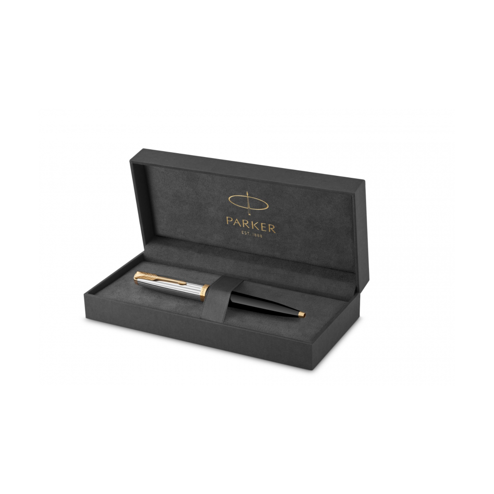 Подарочная шариковая ручка Parker из коллекции 51 Black GT выполнена из литого акрила чёрного цвета. Декоративные элементы отделаны позолотой. Изделие отлично подойдёт в качестве подарка как для коллеги, так и для руководителя. Ручку удобно закреплять на ежедневнике, планшете или кармане благодаря прочному клипу из нержавеющей стали с позолотой. Диаметр пишущего узла составляет 1,0 мм, толщина линии – 0,8 мм. Ручка упакована в оригинальную премиальную подарочную коробку Parker c откидной крышкой. Поставляется в комплекте с шариковым стержнем чёрного цвета.