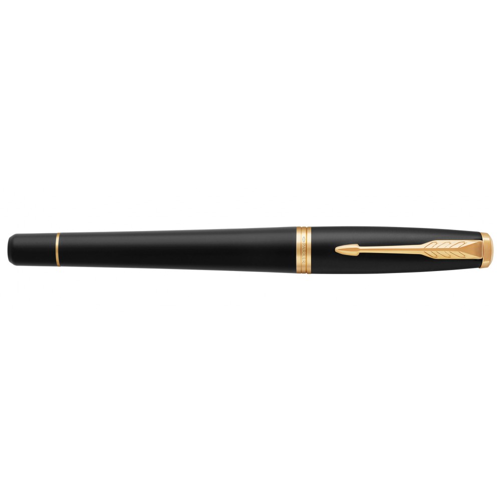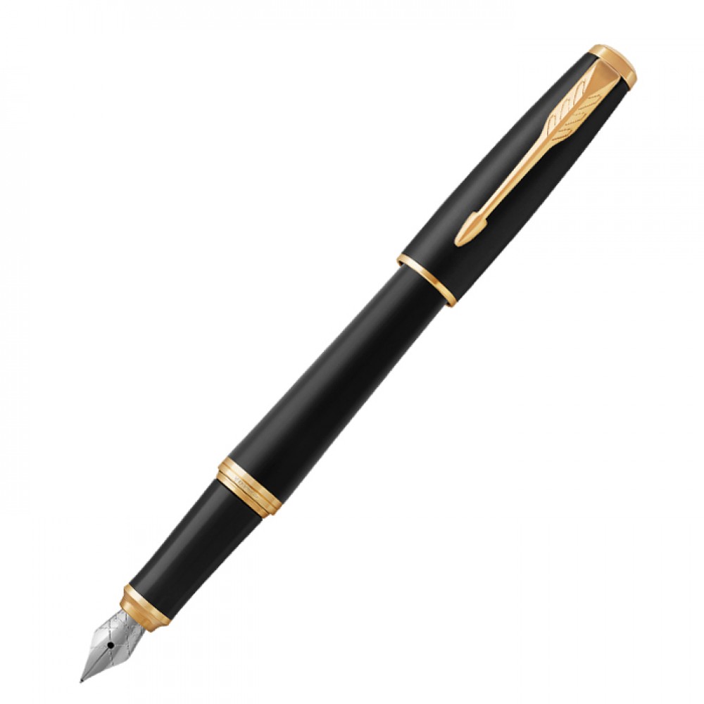 Модель 2017 года, перьевая ручка Parker Urban Muted Black GT ("Паркер Урбан Мьютид Блэк Джи Ти") из обновленной коллекции Urban. Основные особенности нового дизайна: новый зажим-стрела с тремя широкими перьями, укороченная форма торца ручки, измененный торец колпачка, вместо одного широкого кольца на колпачке теперь три, на среднем кольце выполнена гравировка логотипа PARKER. Корпус и колпачок перьевой ручки выполнен из ювелирной латуни, покрытой матовым черным лаком. Зона захвата теперь изготавливается из прочного полированного черного пластика, а зажим колпачка и другие детали дизайна - из нержавеющей стали, покрытой золотом. Перьевая ручка оснащается пером из нержавещей стали в новой современной форме. Ручка поставляется в престижной подарочной коробке с обновленным дизайном. На боковой стороне коробки нарисованы гербы - подтверждение гарантии Британского Королевского двора. В комплекте также присутствует один пробный картридж и гарантийный талон на два года.