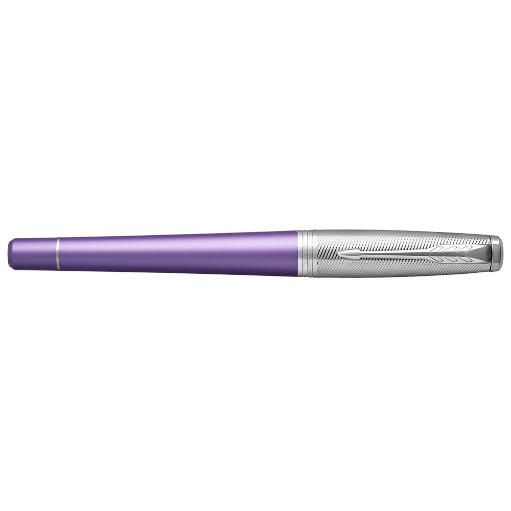 Модель 2017 года, перьевая ручка Parker Urban Premium Violet CT ("Паркер Урбан Премиум Виолет") из обновленной коллекции Urban Premium. Основные особенности нового дизайна: новый зажим-стрела с тремя широкими перьями, укороченная форма торца ручки, измененный торец колпачка, вместо одного широкого кольца на колпачке теперь три, на среднем кольце выполнена гравировка логотипа PARKER. Корпус перьевой ручки выполнен из анодированного алюминия фиолетового цвета, прошедшего пескоструйную обработку. Колпачок из хромированной латуни украшен оригинальной изящной гравировкой. Отдельные детали дизайна покрыты хромом. Перьевая ручка оснащается пером из нержавещей стали в новой привлекательной форме. Ручка поставляется в престижной подарочной коробке с обновленным дизайном. На боковой стороне коробки нарисованы гербы - подтверждение гарантии Британского Королевского двора. В комплекте также присутствует один пробный картридж и гарантийный талон на два года.